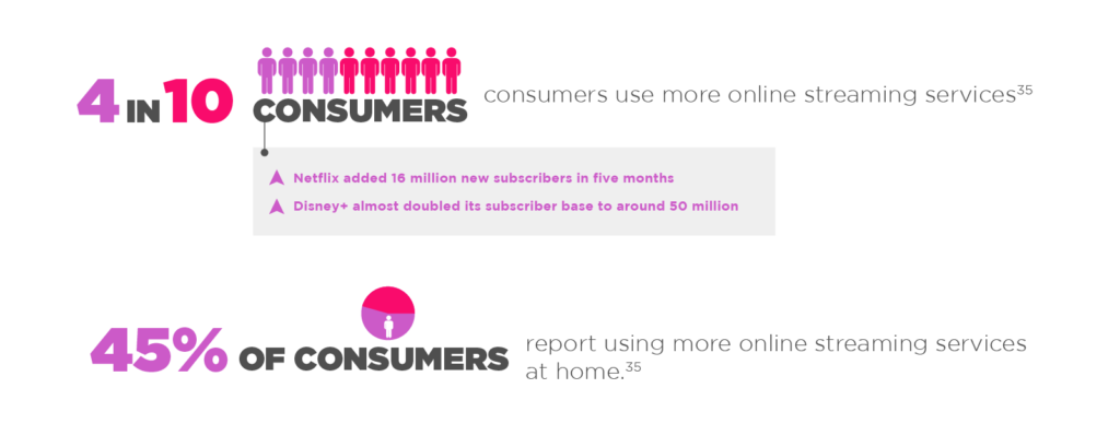 People have more time for leisure activities, consequently clocking in more usage of media streaming platforms, online gaming and social media. In fact, when it comes to consuming videos, a Wistia report claims that “consumers watched more than 23,000 years worth of videos in 2020.” Moreover, they are expected to spend more time on at-home activities, even when stricter restrictions are lifted.45 Interestingly, around 40% of new gamers agree that they will continue to spend more time and money on playing.