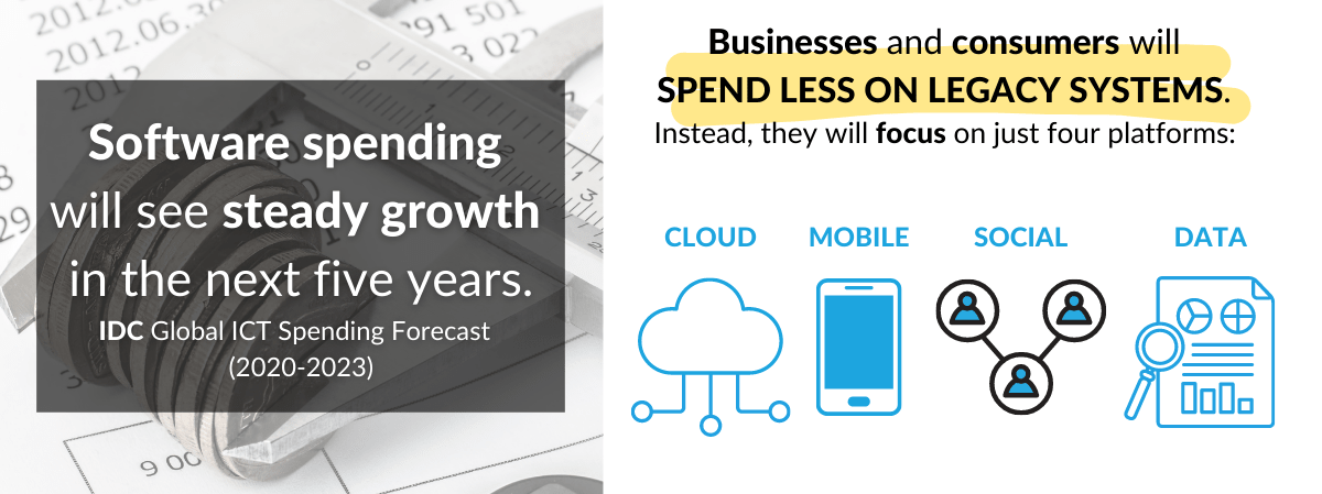 An IDC report13 suggests that software spending will see steady growth in the next five years. In this regard, businesses and consumers will SPEND LESS ON LEGACY SYSTEMS and focus on just four platforms: CLOUD, MOBILE, SOCIAL and DATA.